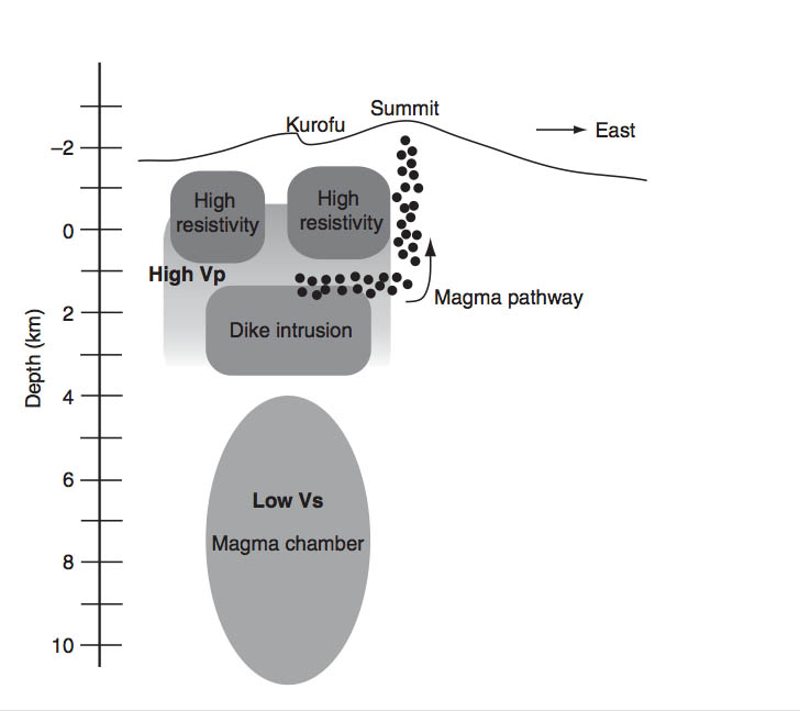 Now you get the picture – the upwelling lava has forced the country rocks aside for several kilometres. You follow this dyke – a giant underground ravine – for several kilometres, more or less horizontally.It takes you westwards and slightly north of Asama’s summit, out under the old Kurofu crater rim. Strange, you ponder: wherever the lava that feeds Asama’s eruptions comes from, it seems not to rise from directly beneath the mountain.